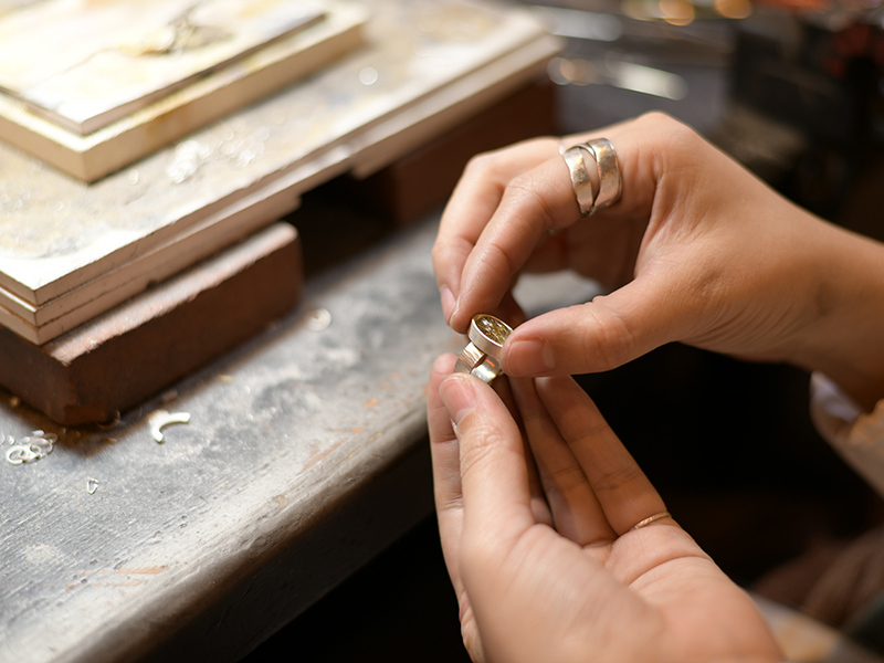彼女の手掛けるジュエリーは全てが手作業で行われるため、溶かした金属などをあらかじめ作製しておいた鋳型に流し込み、それを冷やすことで固める鋳造とは違い、大量生産にはない、世界に一つだけしかないジュエリーができあがる。