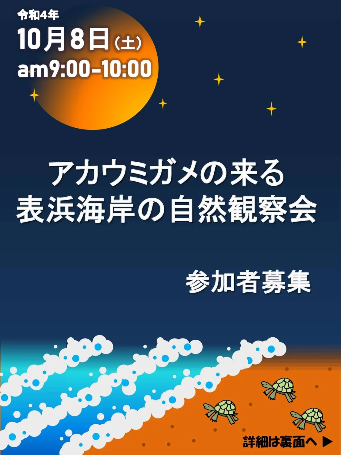 この夏、豊橋市の表浜海岸で産卵したアカウミガメの卵が、9月から10月にかけてふ化します。この期間に合わせ、表浜海岸の豊かな自然を次世代に残す大切さについて考えていただくため、自然観察会を開催します。