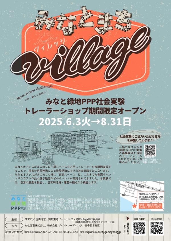みなとオアシスがまごおりエリアの一部に長期間トレーラーを仮設し、市民を始めとする民間事業者が活用することによって将来的な事業性の検討や官民連携の可能性を探るみなと緑地PPP社会実験「みなとまちvillage」が実施されています。